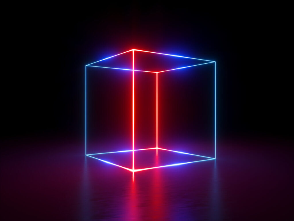 3d de representación, líneas brillantes, luces de neón, fondo abstracto, jaula de cubo, ultravioleta, infrarrojo, colores vibrantes del espectro, espectáculo láser
