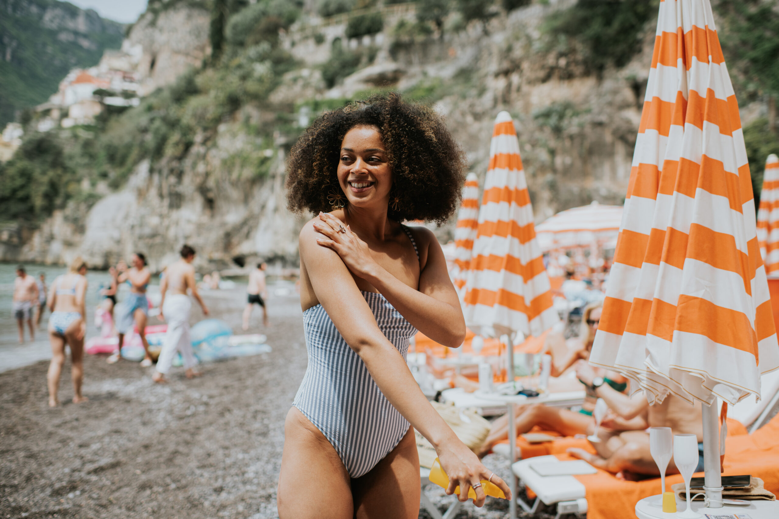 A young woman stands on a rocky, sunny beach with a beautiful Italian landscape visible in the background. She spritzes sun cream from a spray bottle onto her skin and rubs it in to protect herself on a hot day.