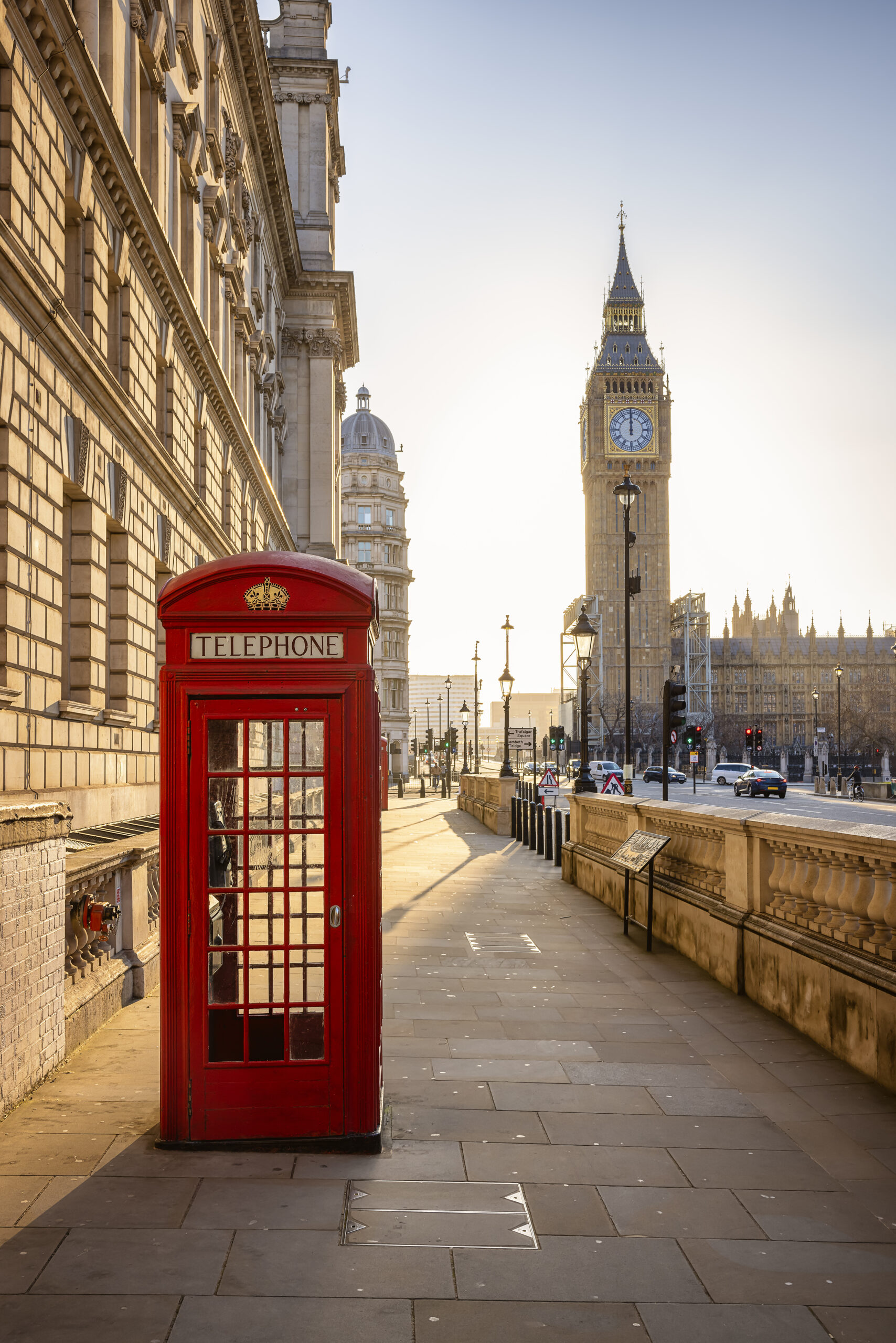 A classic, red telephone booth in front of the Big Ben clocktower in London, Westminster, during golden sunrise without people