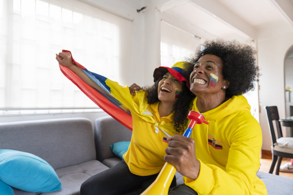 a couple of Afro friends who are fans of the Ecuadorian soccer team get ready for the match at their home dressed in the soccer team’s shirts