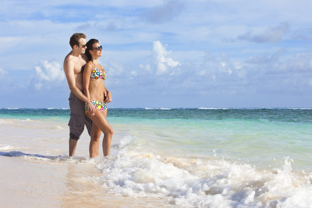 A couple wearing swimsuits stand in the ocean holding hands; punta cana la altagracia dominican republic