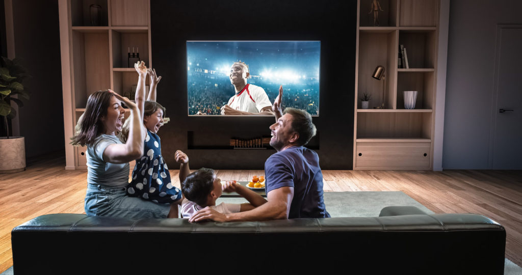 A family is watching a soccer moment on the TV and celebrating a goal, sitting on the couch in the living room. The living room is made in 3D.