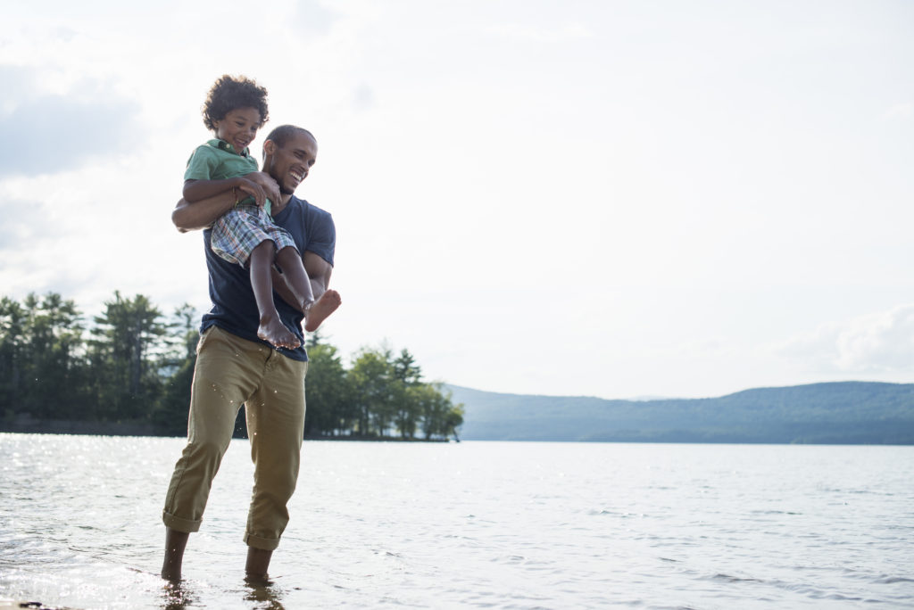 A father and son on a lake shore in summer