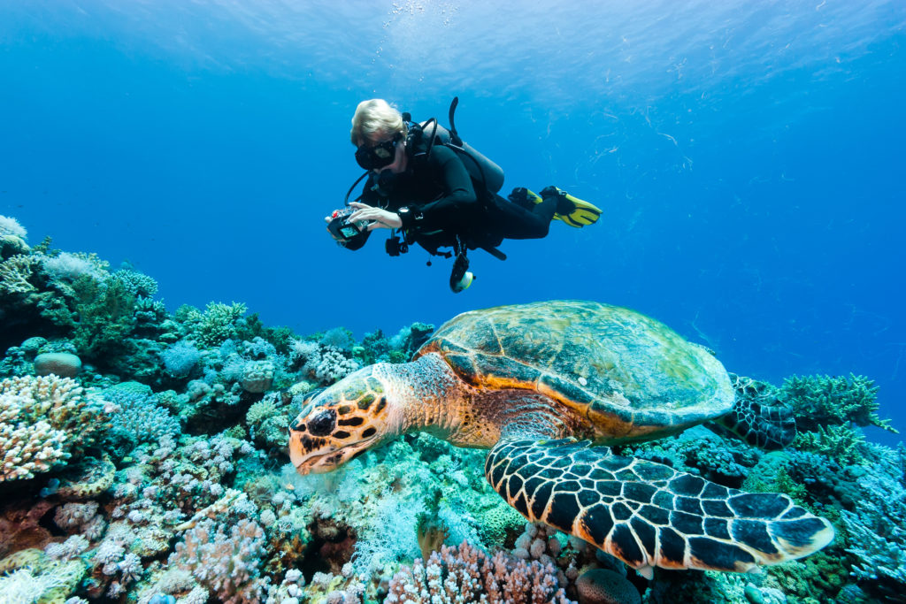 A Hawksbill turtle feeding on a coral reef whilst a SCUBA diver takes photographs