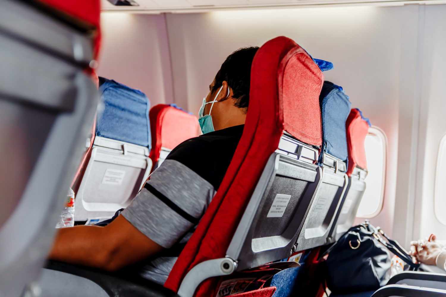 A male passenger traveler wearing mask to protect Corona Virus or Covid-19 & sitting in airplane. It is worn to prevent flu disease.