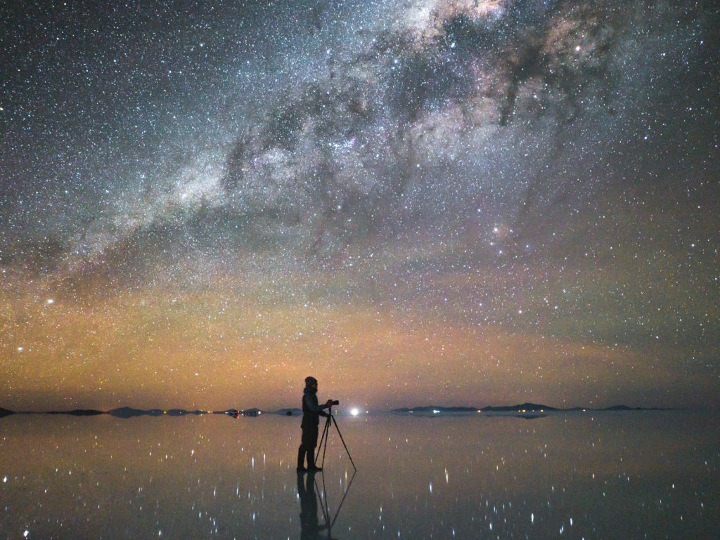 A Man Taking Photograph of Dreamlike Milky Way Across Salt Flat, Uyuni, Bolivia