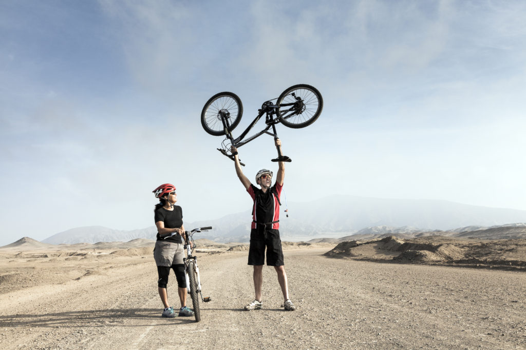 A married couple in their mid forties cycling in the Chilean Atacama desert, the man holding his cycle above his head