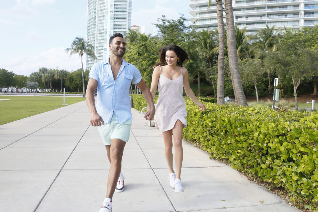 A multiracial millennial man with a beard and a caucasian millennial woman with long dark hair, happily walk together in an outdoor park, wearing casual summer clothing.