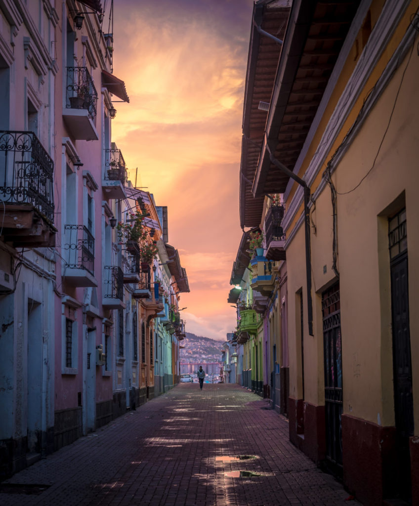 A residential street in Old Town Quito, Ecuador at dusk after a heavy rain storm. The sky is lit with orange and yellow as lone figure walks the cobbled street. Puddles reflect the colour of the sky.