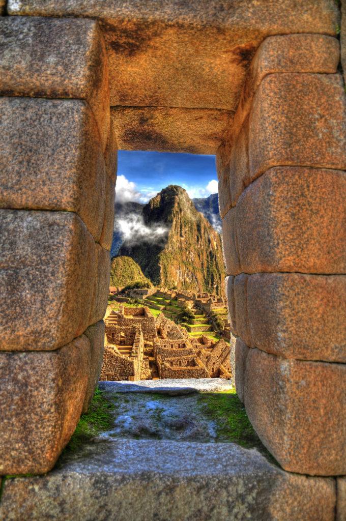 A window to Machu Picchu. Artistic HDR image of the magnificent view of the lost Incan city of Machu Picchu near Cusco, Peru through an ancient window