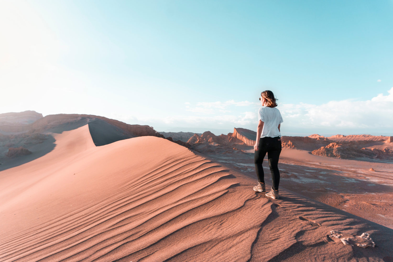 A woman traveller in rocky desert during sunset. Rocky hills in desert in Atacama, Chile. Sandy desert during sunset. Woman walking on sand dunes in Antofagasta. Desertscape.