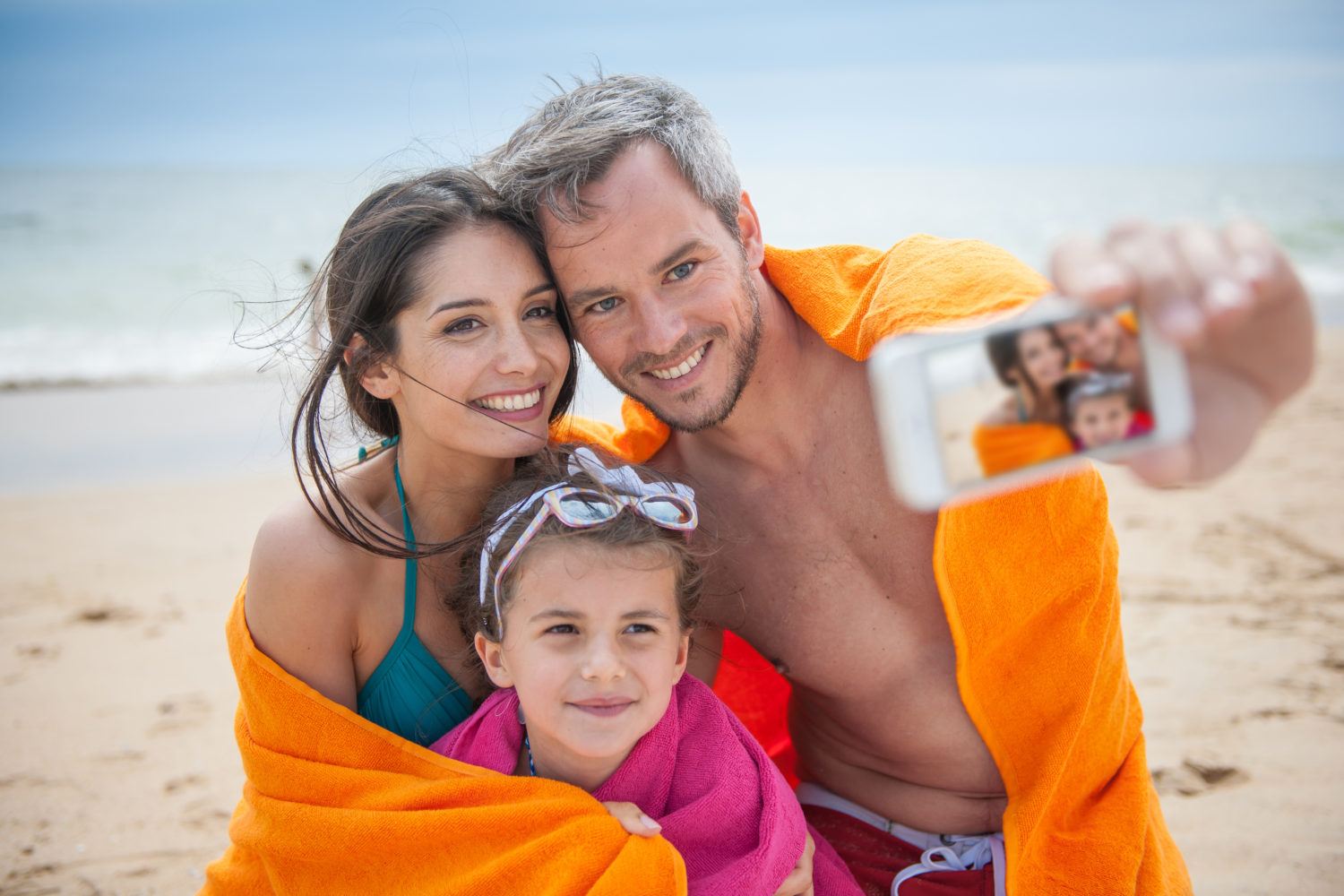 A young couple and their daughter are taking a selfie at the beach. Focus on the screen of the phone