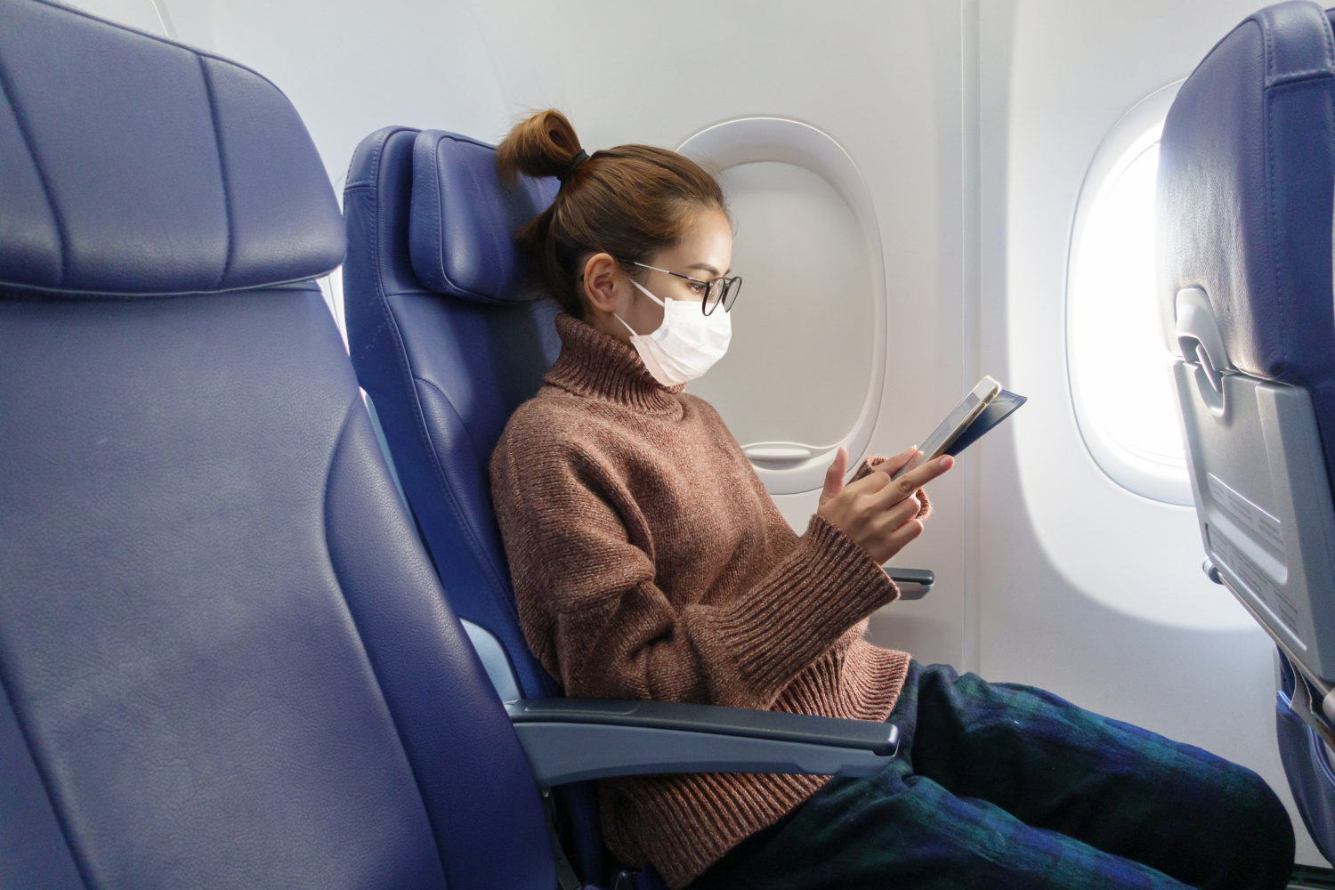 A young woman wearing face mask is traveling on airplane , New normal travel after covid-19 pandemic concept