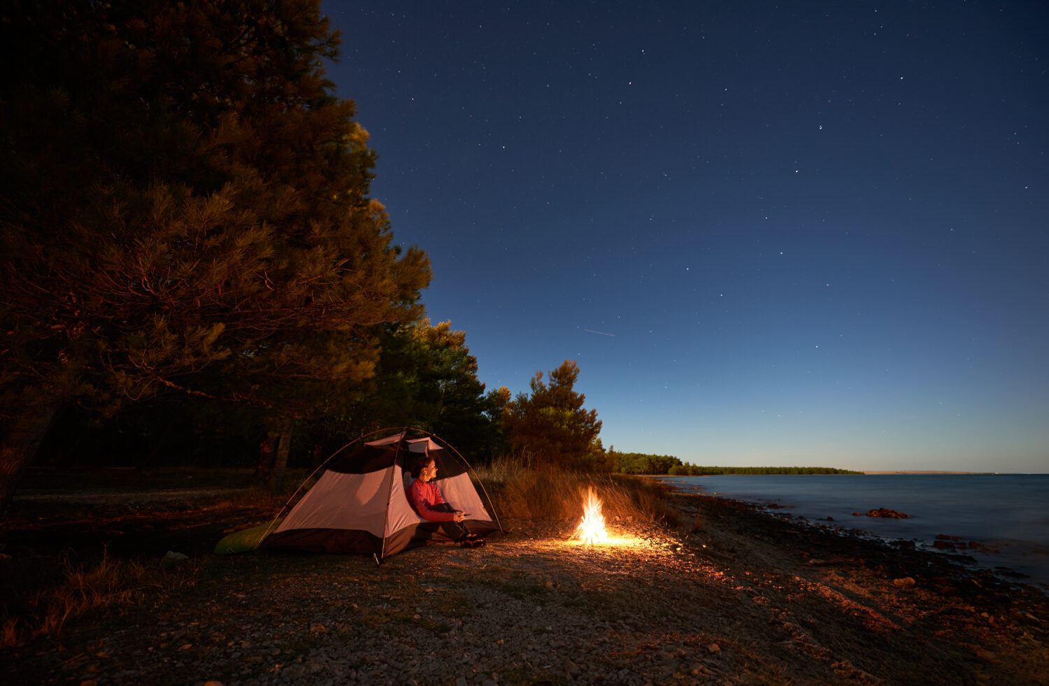Acampada nocturna en el mar. Bonita chica excursionista descansando en la entrada de una tienda cerca del bosque en una fogata bajo un brillante cielo estrellado, disfrutando de hermosas vistas del agua azul claro. Turismo, concepto de estilo de vida activo