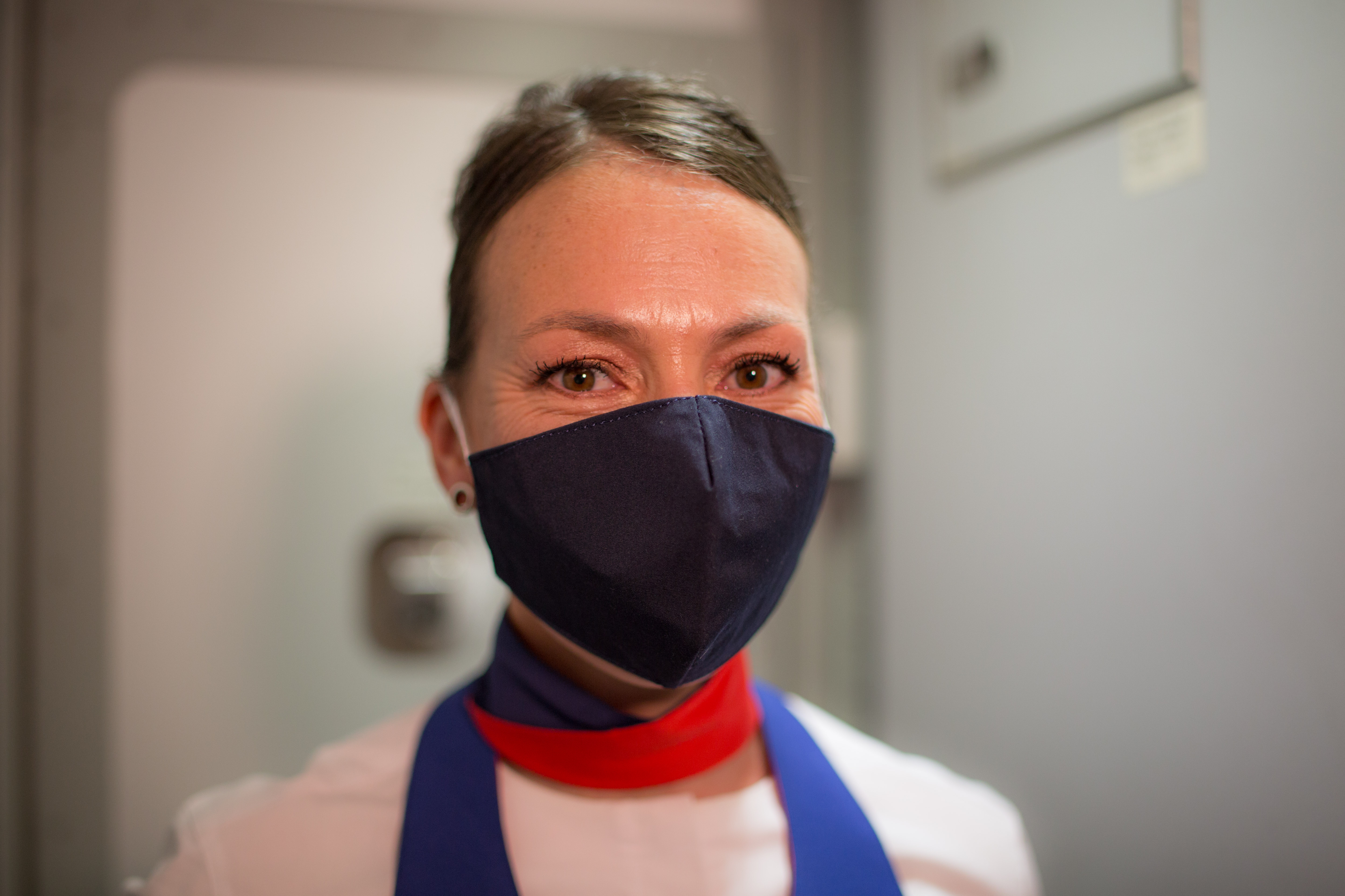 Acercamiento tripulación servicio a bordo mujer con mascarilla