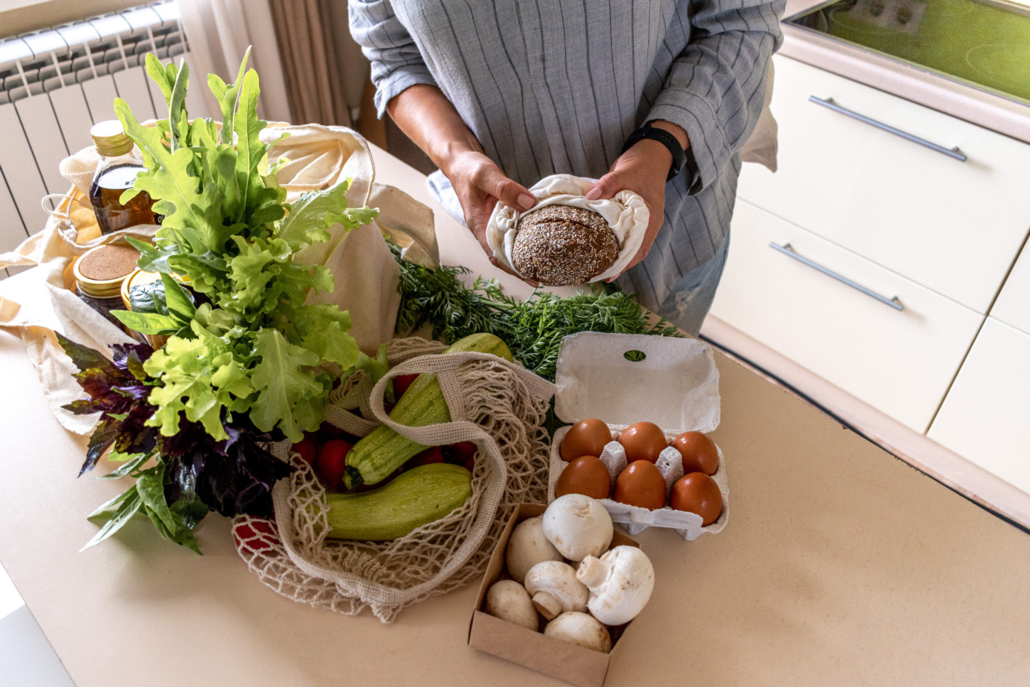 Adult woman pulls out the purchased products from farmers market from the fabric bags. Eco-friendly shopping. Zero waste concept. Conscious consumption.