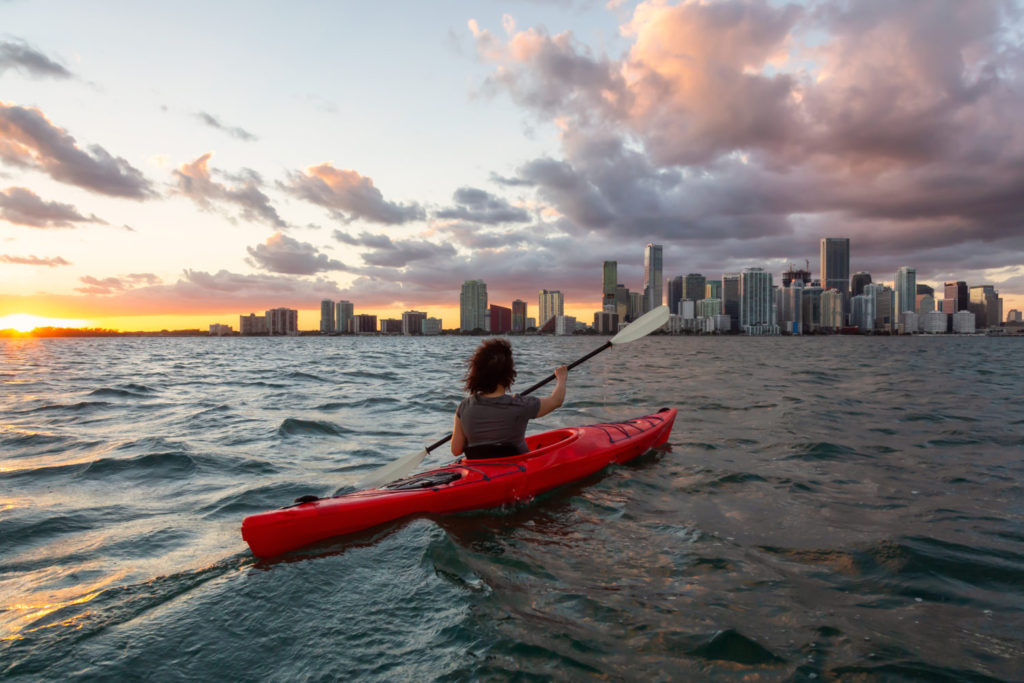 Adventurous girl kayaking in front of a modern Downtown Cityscape during a dramatic sunset. Taken in Miami, Florida, United States of America.