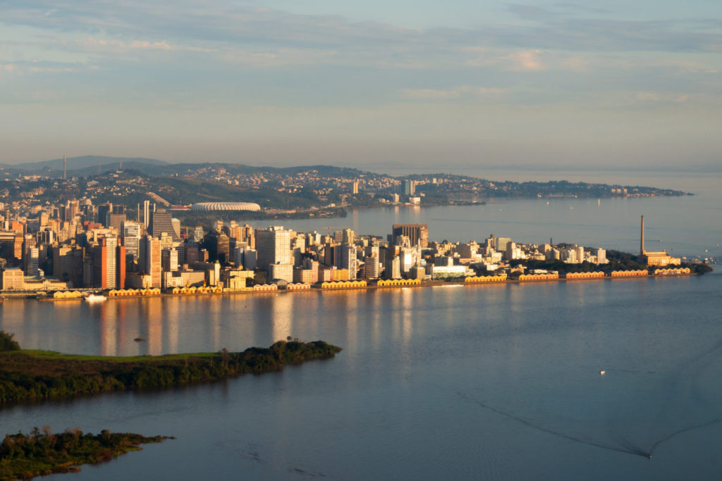 Aerial overview of Porto Alegre, Brazil. Beautiful sunset light illuminating the downtown skyline with reflection on Guaiba River water. Administrative building and football stadium visible.