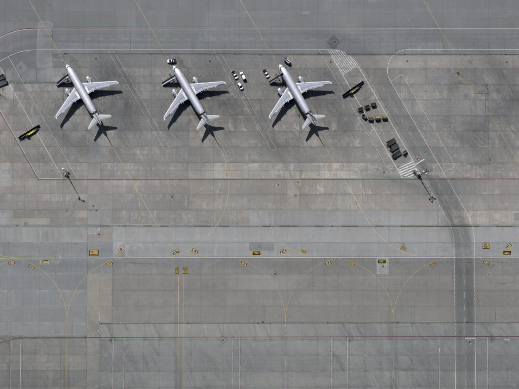 Aerial view airplanes parked on tarmac at airport