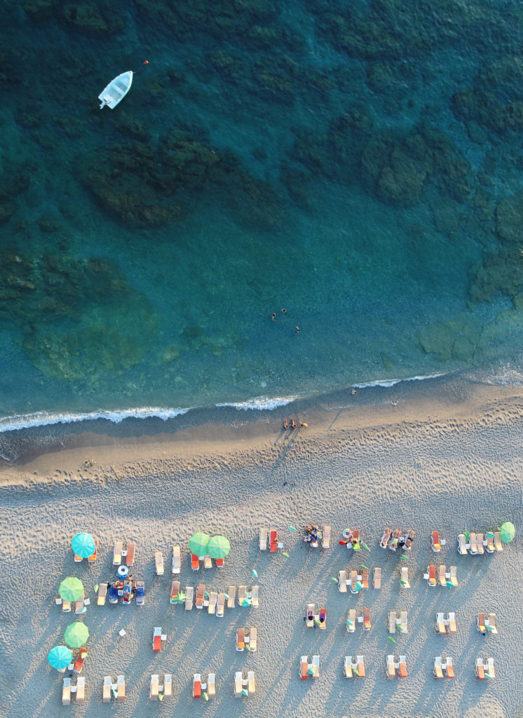 Aerial view of a crowded beach, umbrellas and people on the sand