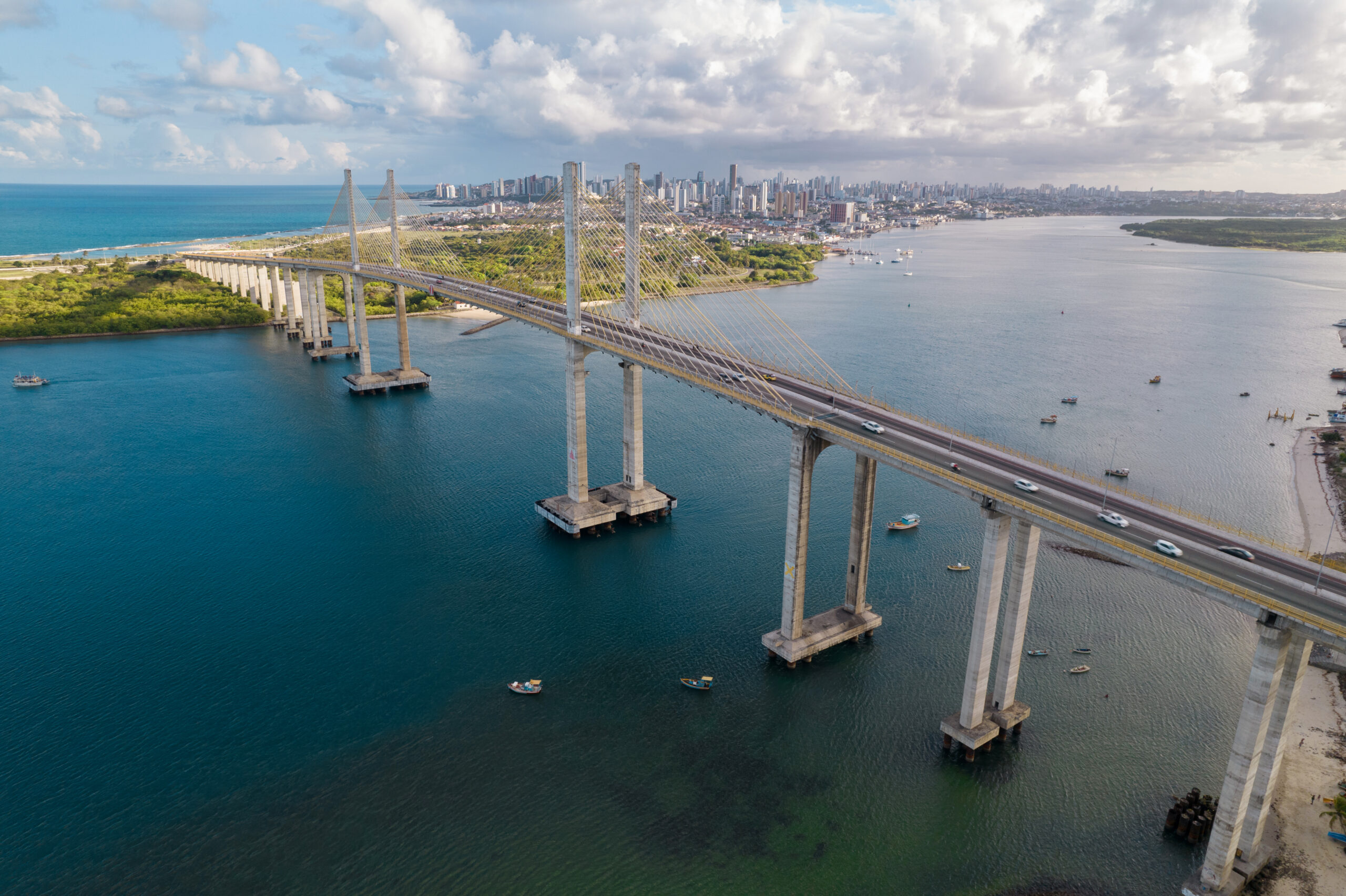 Aerial view of breakwater and Newton Navarro Bridge, Rio Grande do Norte, Brazil