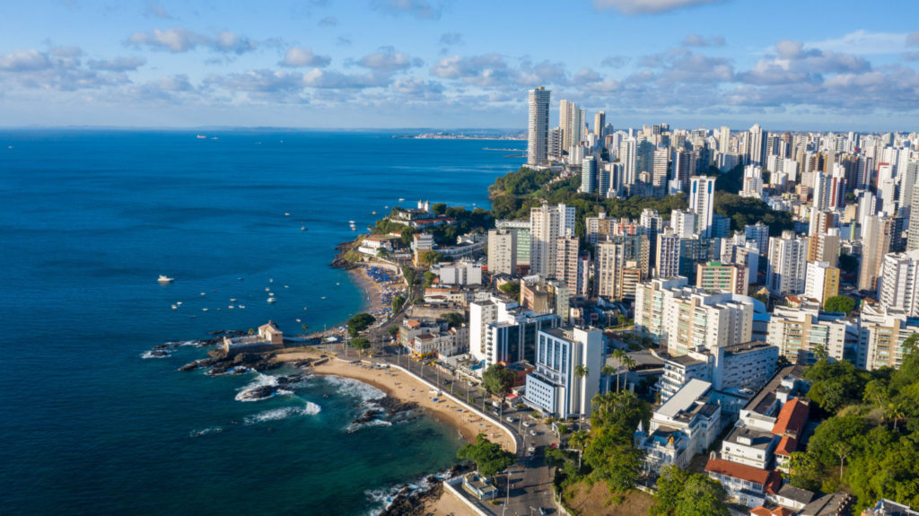 Aerial view of cityscape of Salvador, modern city skyline with skyscrapers – Bahia, Brazil, landscape panorama of South America from above