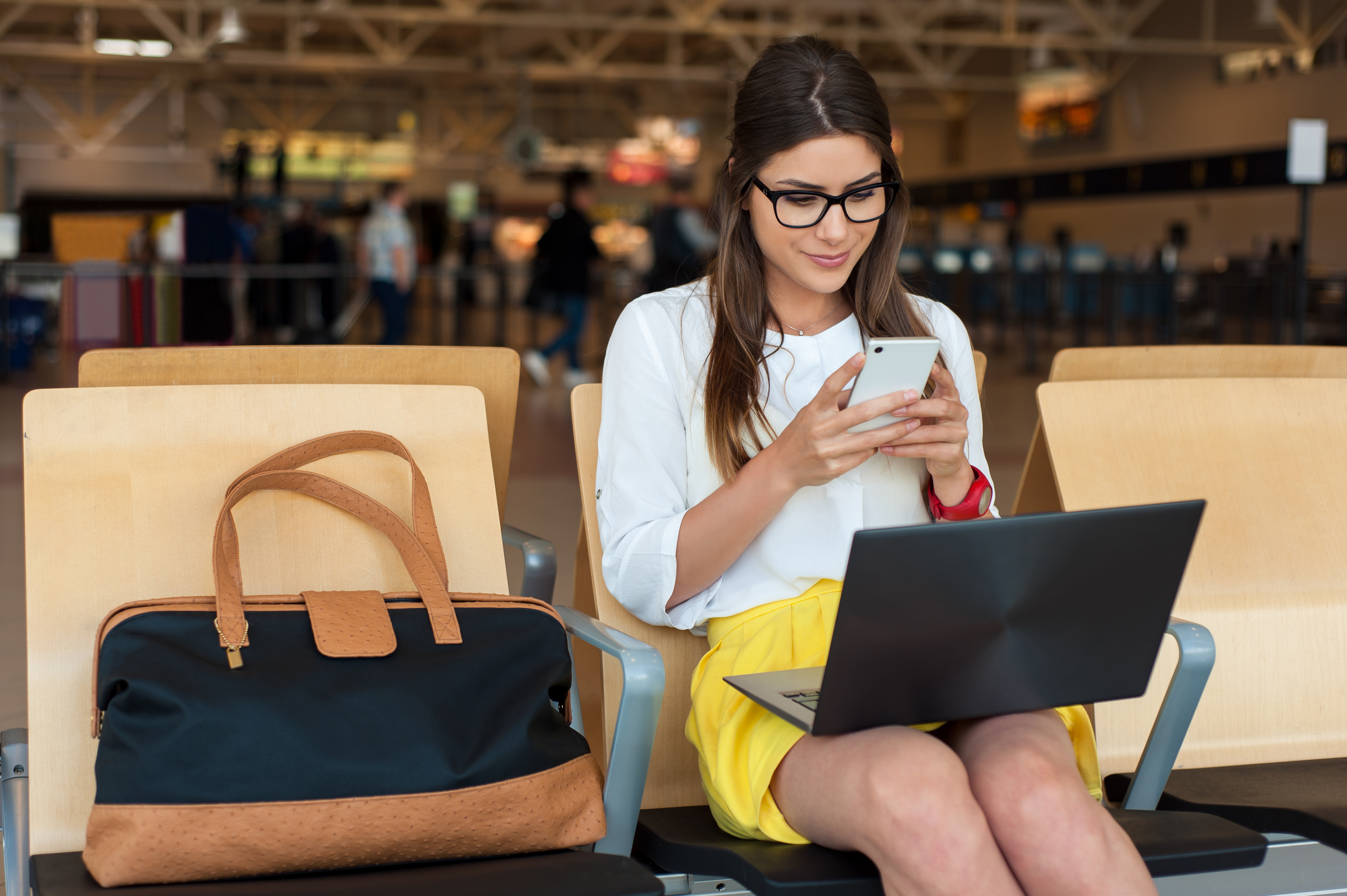 aeropuerto joven pasajera con telefono inteligente y laptop sentada en