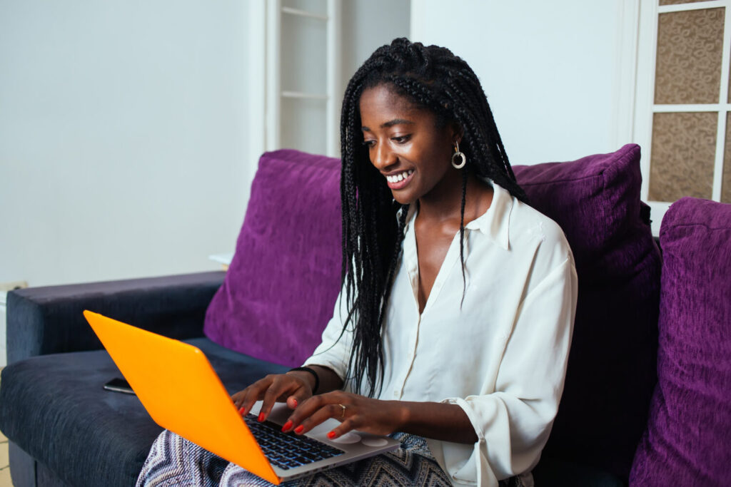 Alegres mujeres independientes de piel oscura que escriben en computadoras portátiles comparten contenido multimedia y multimedia en redes sociales, una mujer próspera y sonriente independiente que disfruta de un trabajo remoto desde el interior de su casa