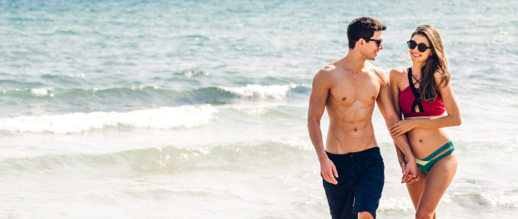 Amantes románticos jóvenes parejas felices dándose la mano caminando sobre la arena por mar divirtiéndose y relajándose junto con banner de espacio para copiar texto en la playa tropical.Vacaciones de verano y viajes