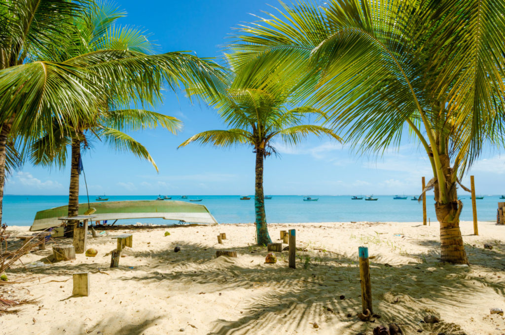 Amazing view of Coroa Vermelha beach in Porto Seguro in Brazil. Relaxing view with coconut trees, canoe, boats and a beautiful blue sea composing the scene.