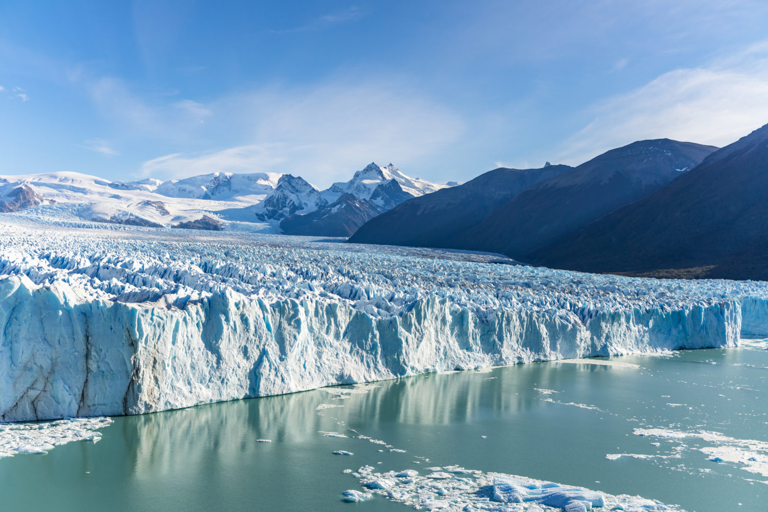 Amazing view of Perito Moreno glacier, blue ice burg glacier from peak of the mountain through the aqua blue lake in Los Glaciares National Park, Santa Cruz, Argentina, southern Patagonia ice field.