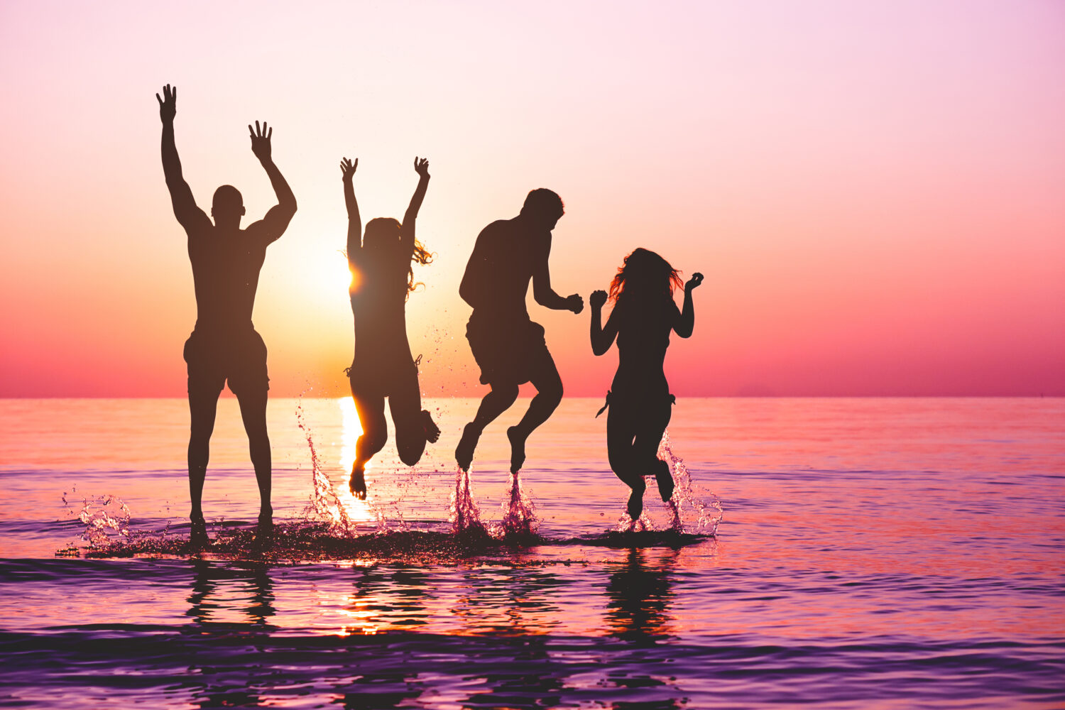 Amigos felices saltando dentro del agua en la playa tropical al atardecer – Grupo de jóvenes divirtiéndose en vacaciones de verano – Estilo de vida juvenil, concepto de fiesta y amistad – Enfoque en los cuerpos