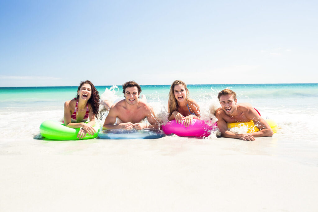 Amigos felices tendidos sobre colchones inflables encima del agua en la playa