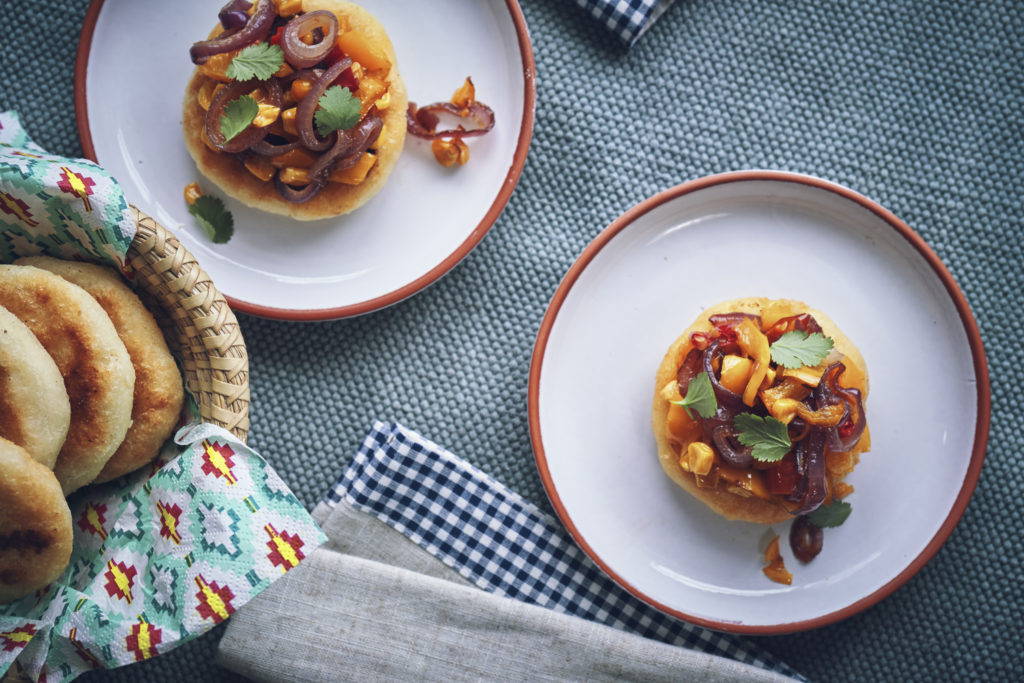Arepas vegetarianas colombianas con Paprika, Maíz, Tomate, Cebolla y Aguacate