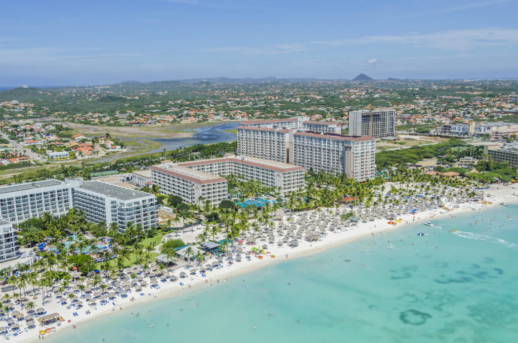 Aerial view of the beach Palm Beach on the island of Aruba. Place where most of the large hotels are located.