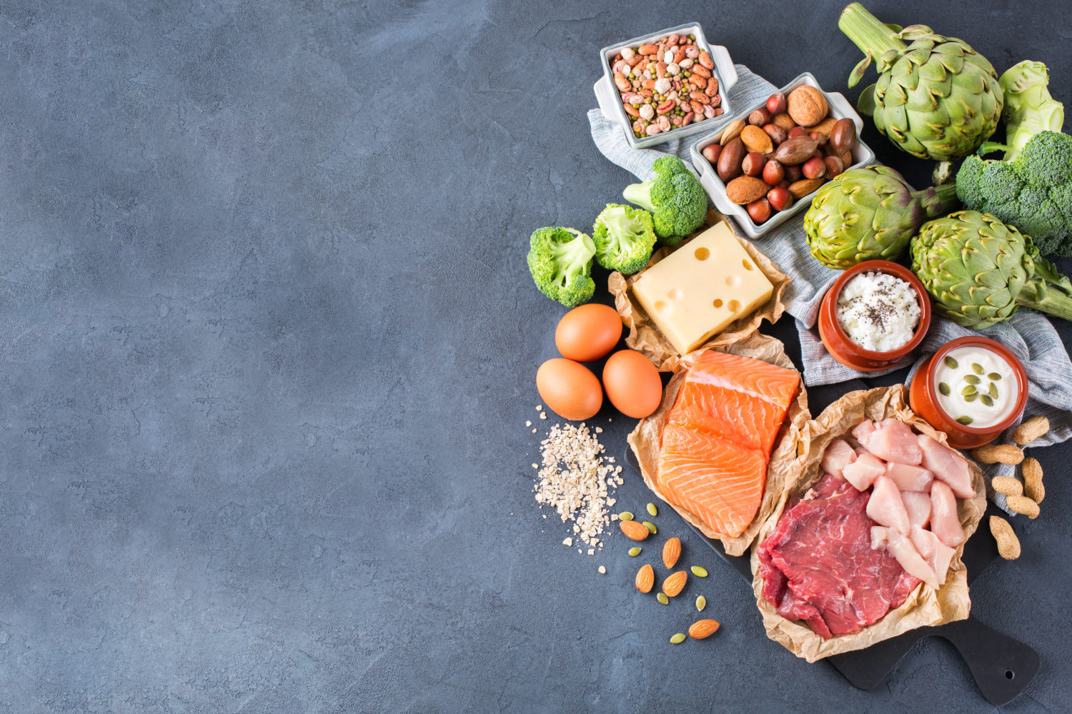 Assortment of healthy protein source and body building food. Meat beef salmon chicken breast eggs dairy products cheese yogurt beans artichokes broccoli nuts oat meal. Copy space background, top view