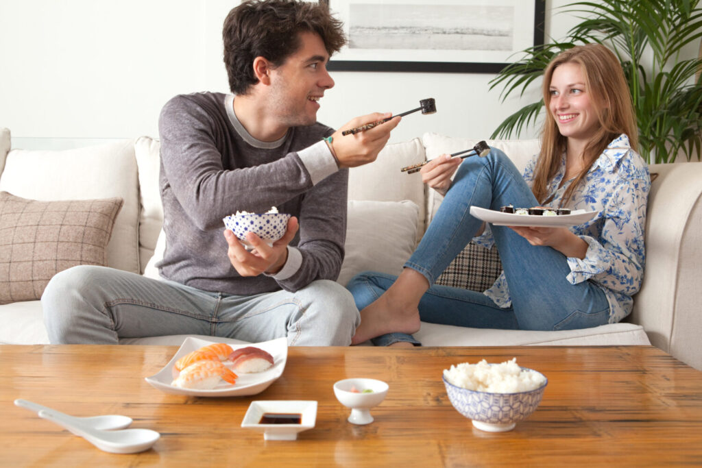 Atractiva pareja joven que tiene una noche en casa y disfruta comiendo japonés se lleva comida. Pareja relajándose en el sofá de casa comiendo comida exótica con el hombre ofreciendo comida en un interior hogareño.