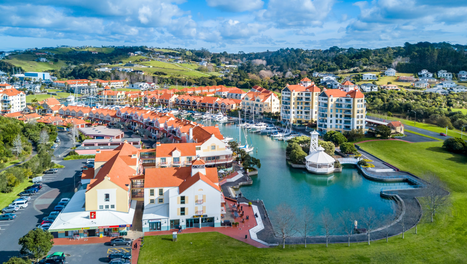 Auckland, New Zealand – 17th, July 2017: Aerial view on Whangaparoa residential area with marina and green hills on the background