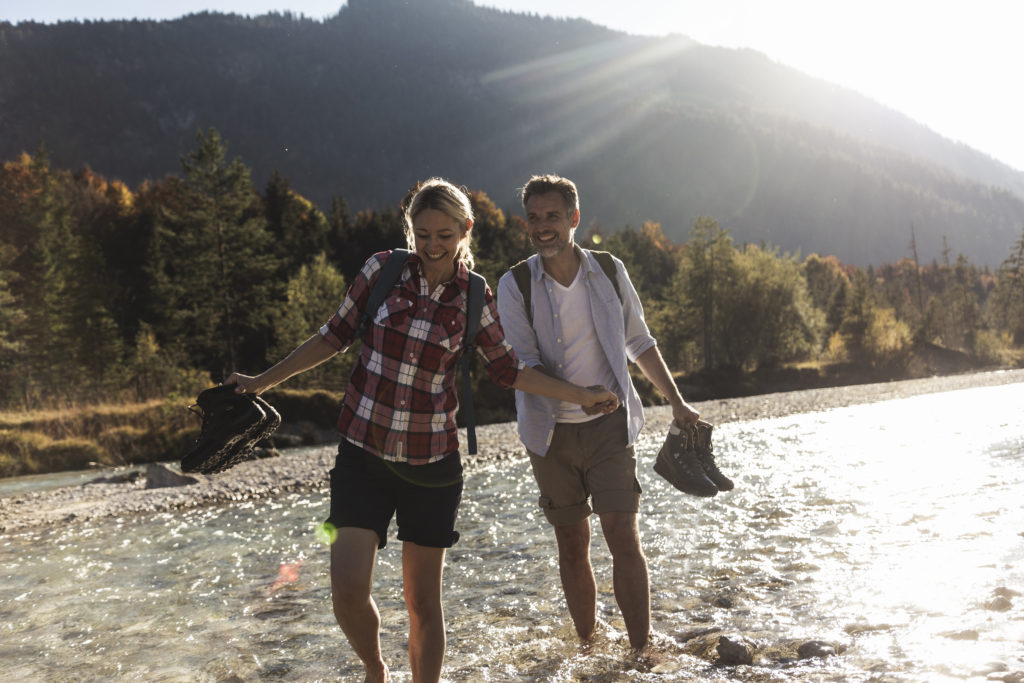 Austria, Alps, couple on a hiking trip wading in a brook