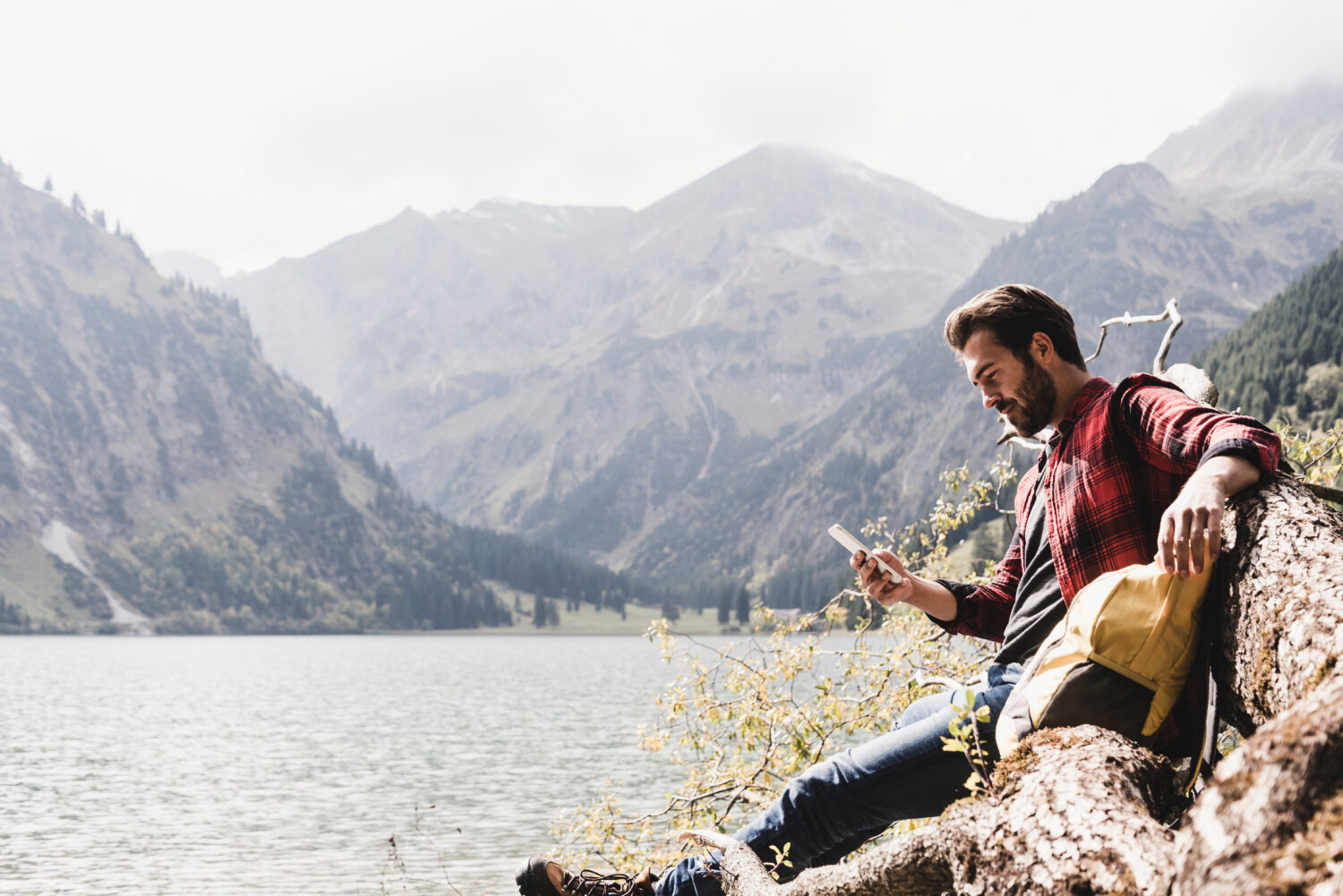 Austria- Tirol- Alpes- excursionista relajándose en el tronco de árbol en el lago de montaña revisando el teléfono celular