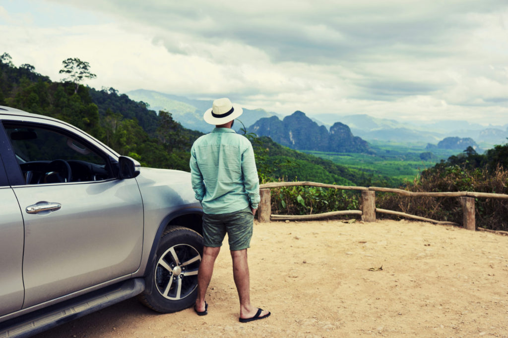 Back view of a man is thinking about this amazing world, while is standing on a mountain against jungle view. Young male traveler is enjoying beautiful landscape during road trip on suv in Thailand