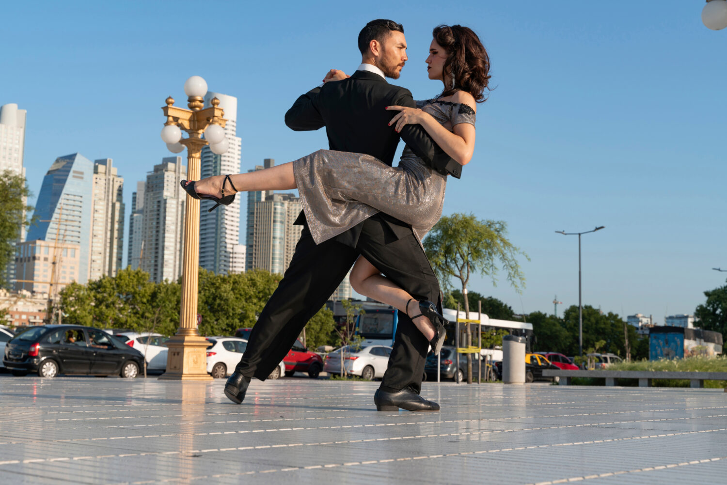Bailarinas masculinas y femeninas mirándose entre ellas mientras practican la danza del tango en el sendero
