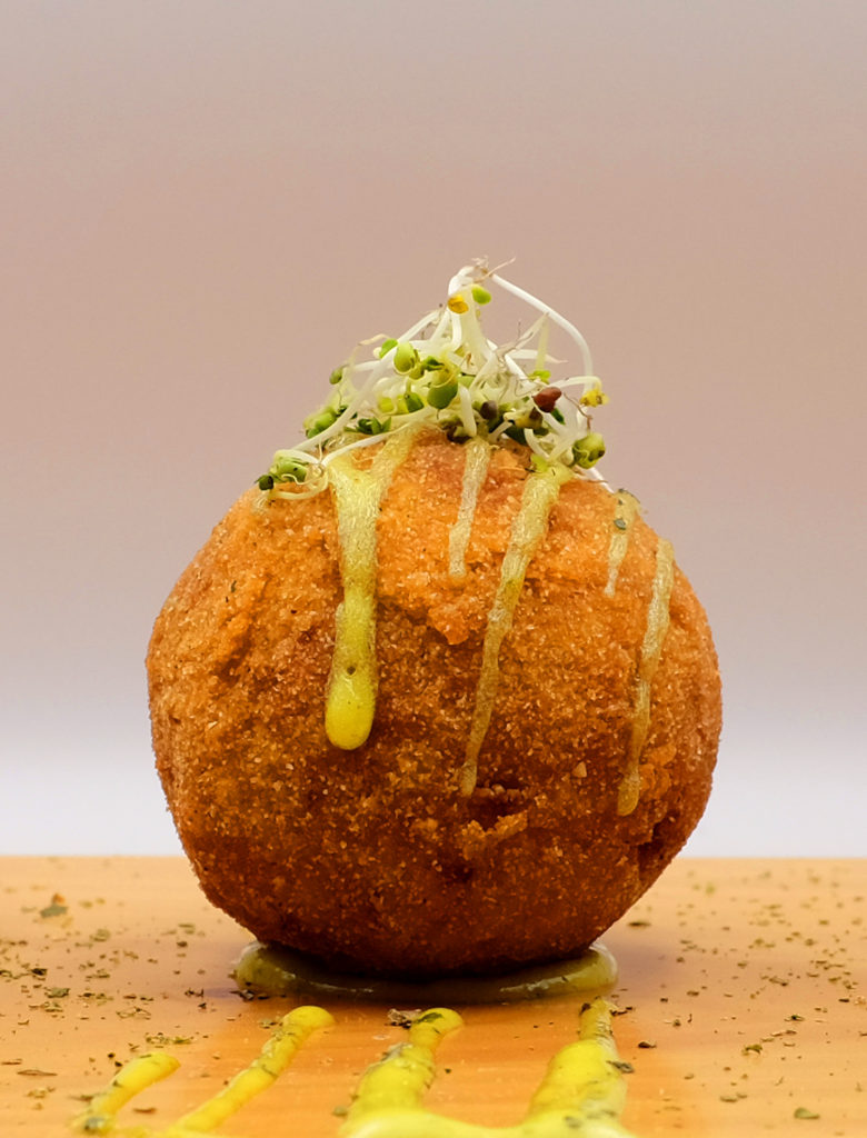 Balls made of green banana, “Bolones de verde” with cheese, peanuts, and/or pork chicharrones. (Traditional food of South America, Ecuador: Costa Rica, Chile. Peru, etc)