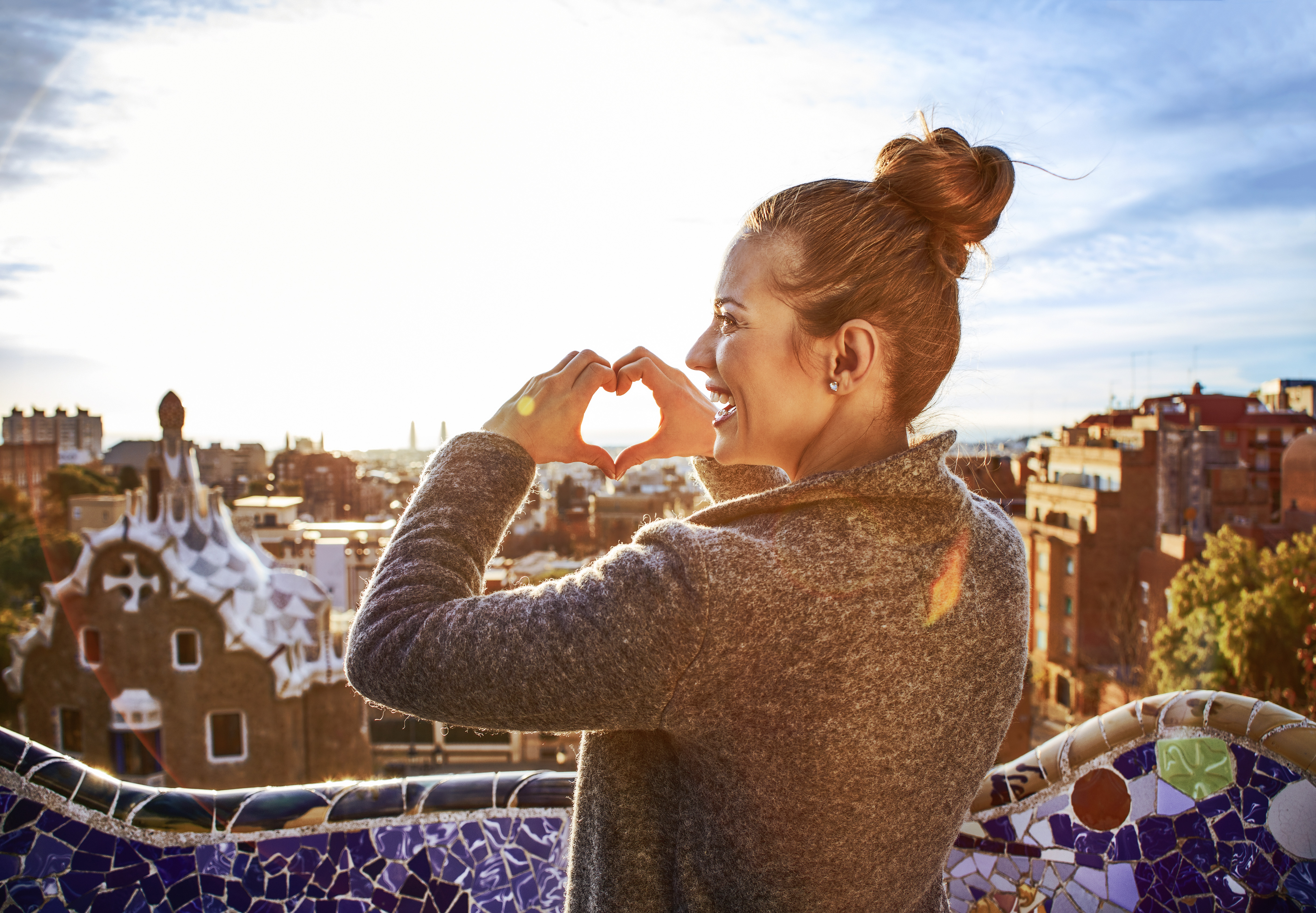 Barcelona signature style. Seen from behind young tourist woman in coat in Barcelona, Spain showing heart shaped hands ID: 26222