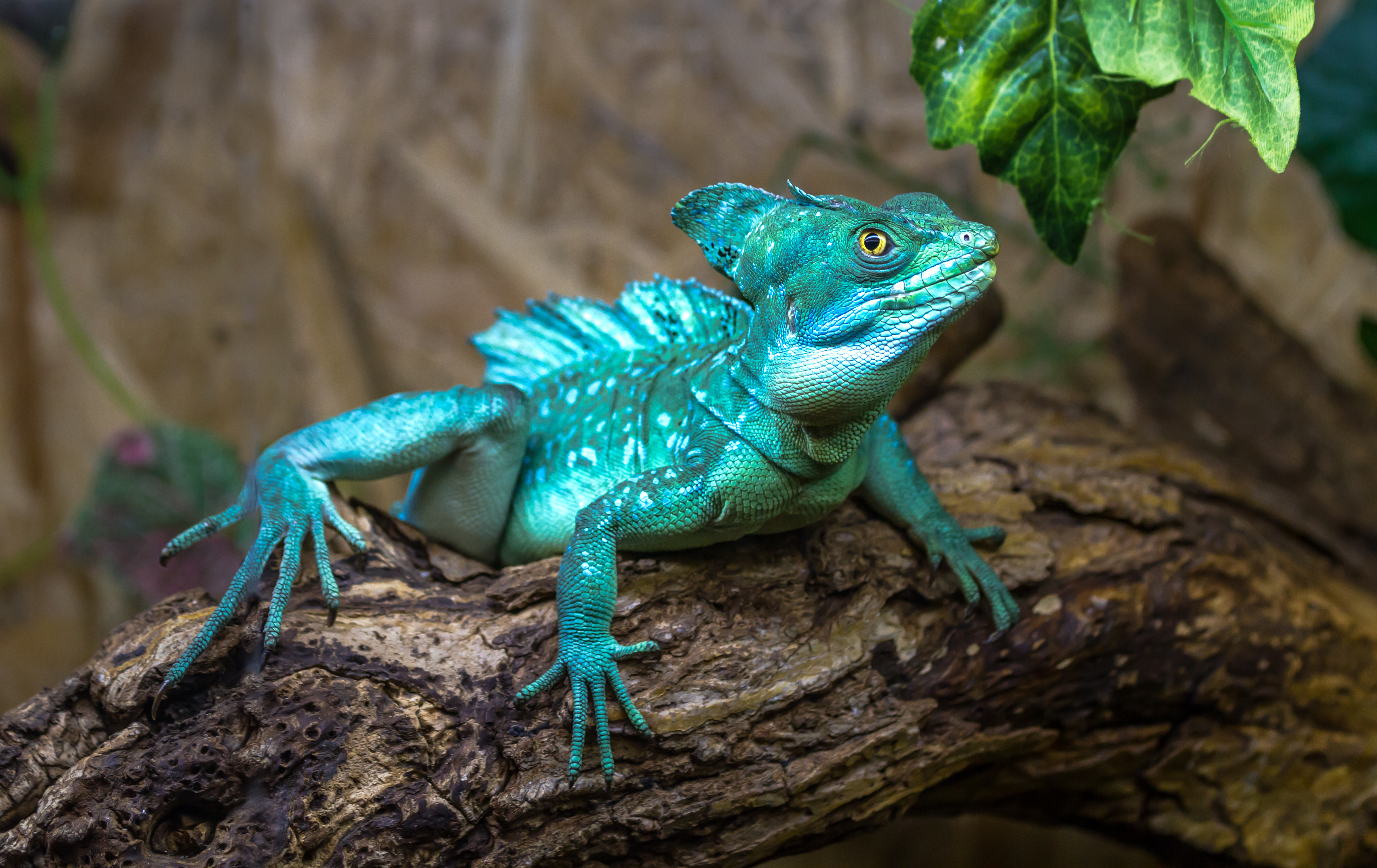 Basiliscus basiliscus se sienta en un tronco de madera con hojas. Basiliscus basiliscus – un lagarto de madera habitando los húmedos bosques tropicales de Guatemala, Nicaragua, Costa Rica, Colombia y Panamá.