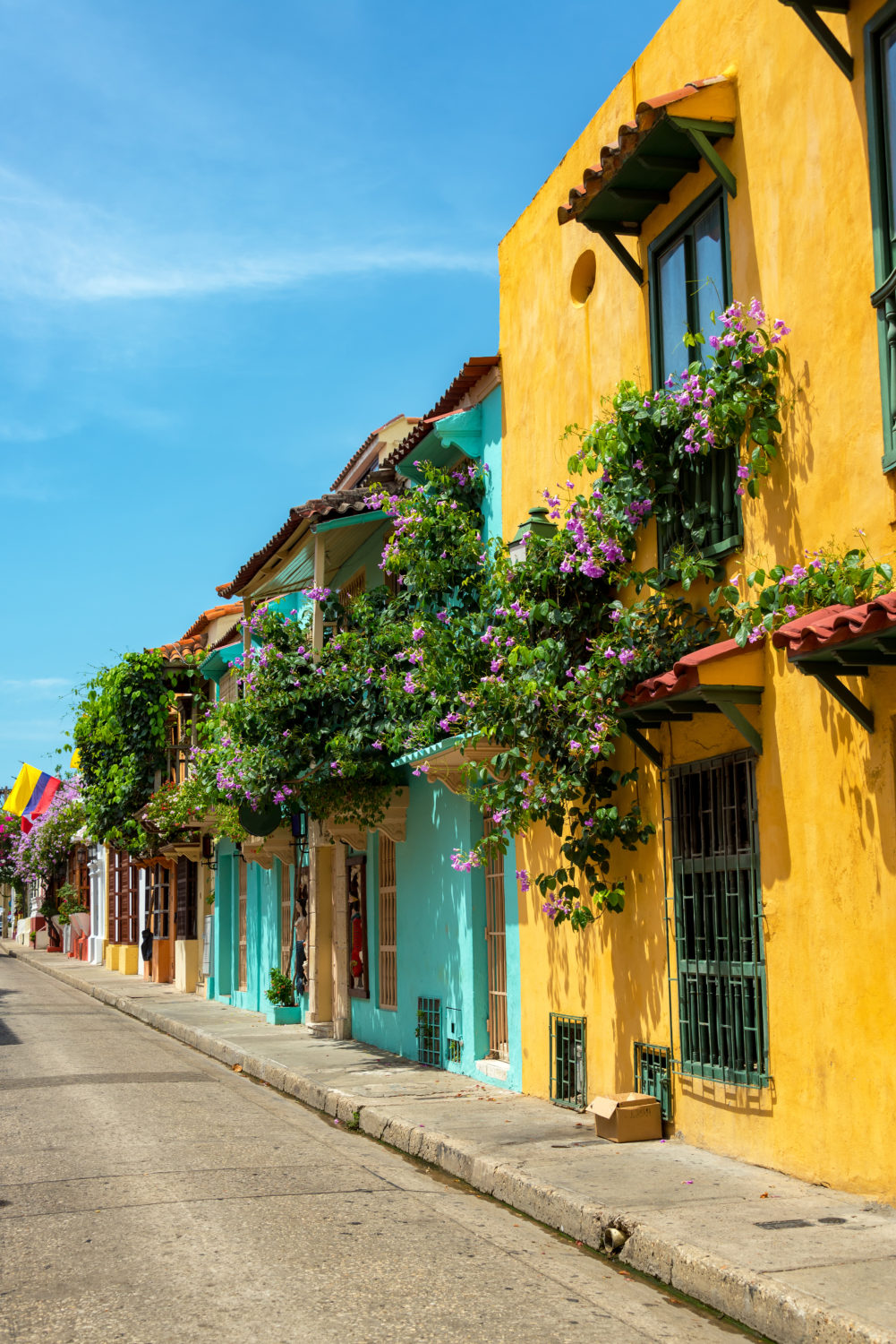 Beautiful colonial buildings covered in bougainvillea flowers in Cartagena, Colombia