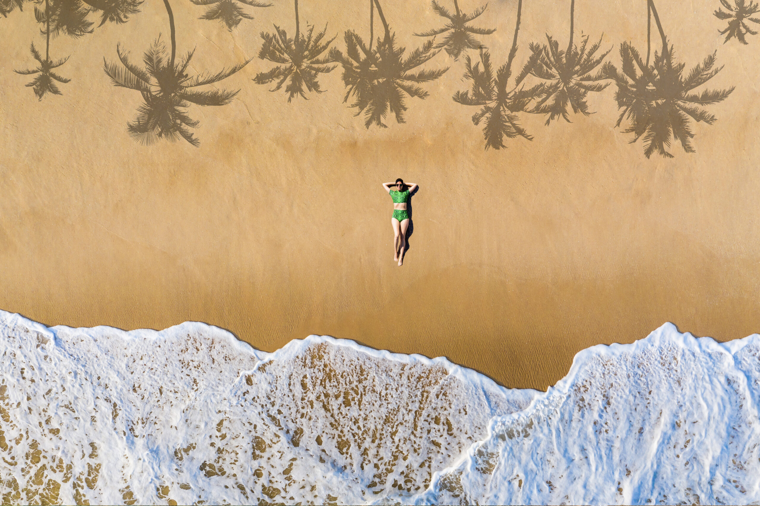 Beautiful girl lies on a sandy beach on a tropical island. Aerial view