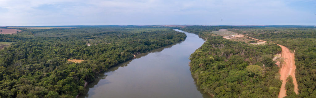 Beautiful panoramic aerial drone view of Rio Teles Pires and Amazon rainforest on sunny summer day with blue sky near Sinop city, Mato Grosso, Brazil. Concept of climate change and natural resources.