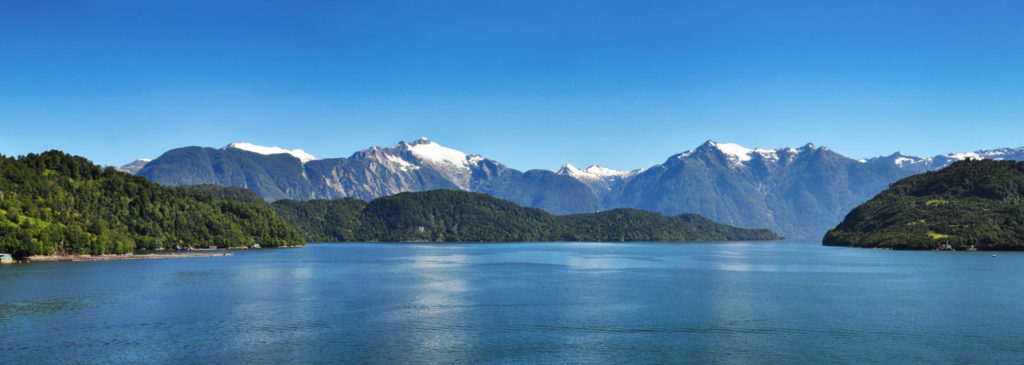 Beautiful panoramic view of Chilean fjords: Aysen fjord and Puerto Chacabuco surrounding area, Patagonia, Chile, South America.