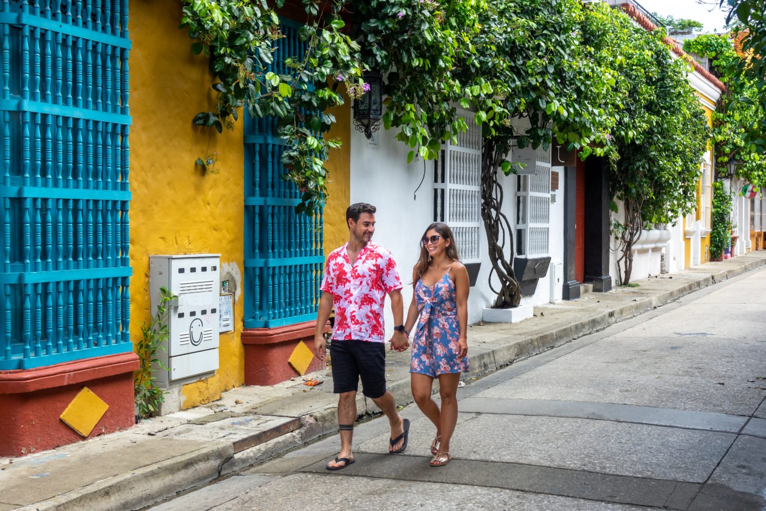 Beautiful tourist couple walking in the colorful streets of Cartagena de Indias, Colombia